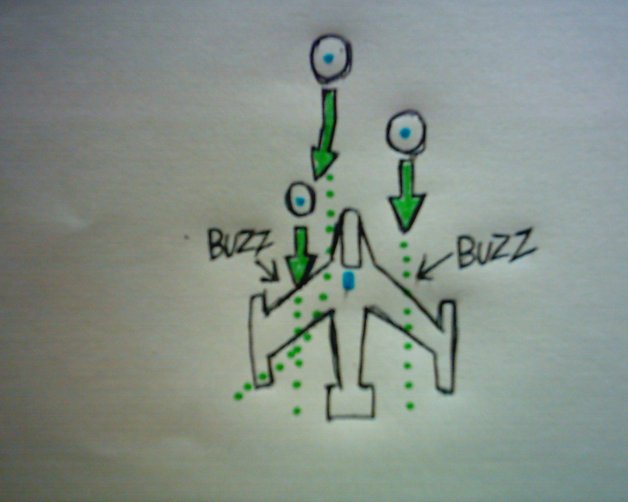 ←自機に敵弾が向かってきています。自機および弾の中心の点が当たり判定になります。点線で示したのが弾道です。このように「自機のグラフィックに重なってはいるがミスにはならない」という状態の時、BUZZとなりバシッという効果音がそれを知らせます。